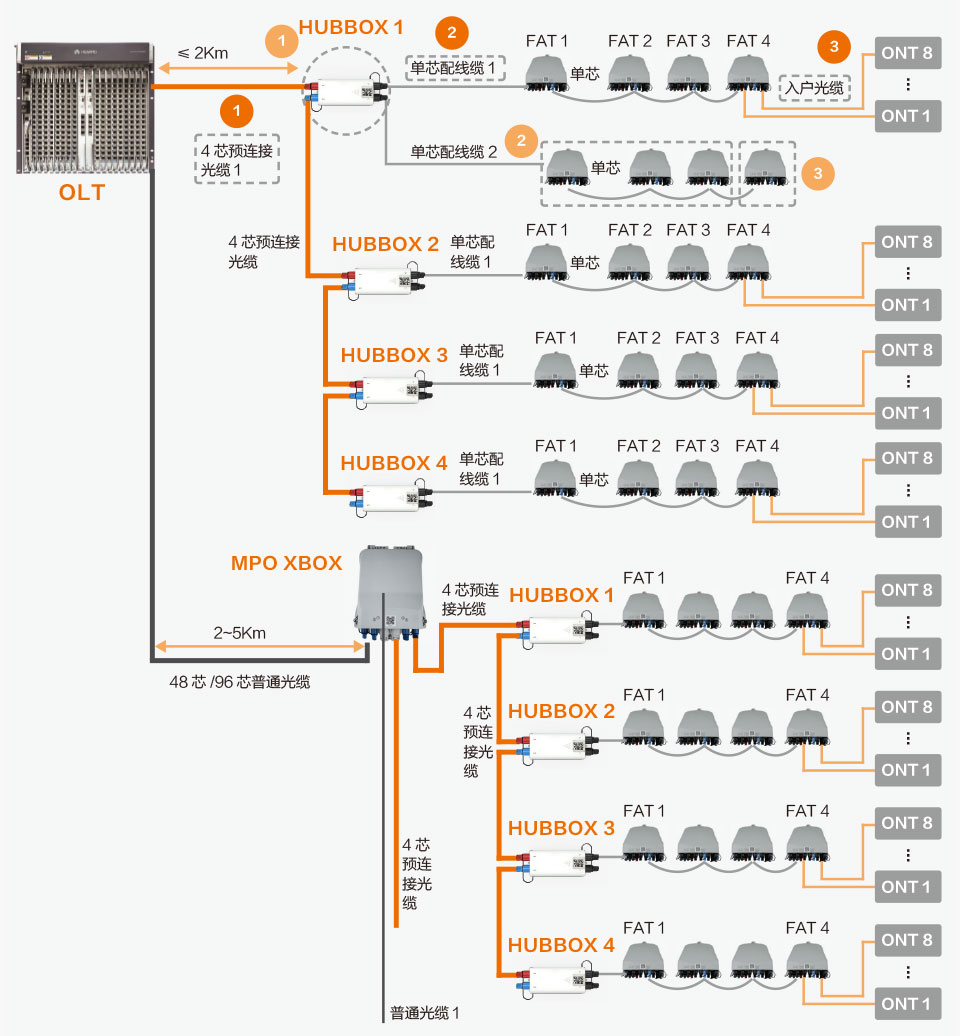 此方案(如圖9)包含三個盒子,即HUBBOX、SUBBOX、ENDBOX和三根纜,即MPO光纜、單芯配線纜、入戶光纜。每個HUBBOX對4個GPON口的纖芯進行1:2分光,輸出8條鏈路。SUBBOX是不等比分光,可級聯(lián)4個FAT,每個FAT可連接8個用戶。離OLT較遠的區(qū)域可用普通光纜+MPO XBOX方案,XBOX不僅可以直接與12芯預連接光纜相連,還可以與普通光纜連接輸出。方案全程預連接,非常適合架空場景,安裝效率高、故障率低。