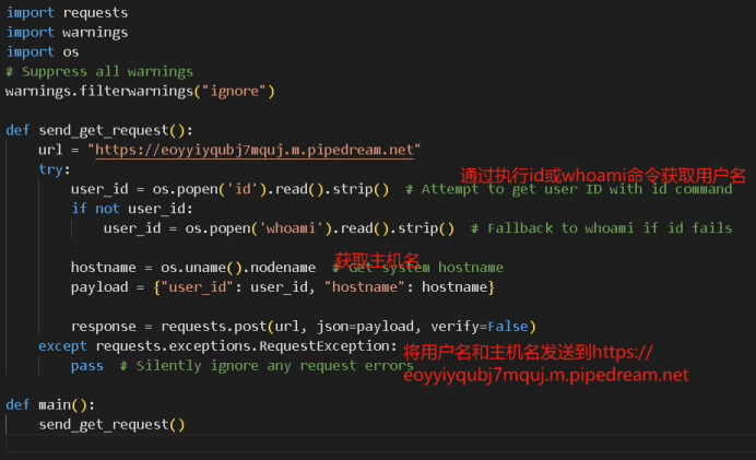 從代碼的注釋風(fēng)格和結(jié)構(gòu)化編寫方式來看,兩段惡意腳本可能是在 AI 的輔助下生成的。例如,代碼中的典型注釋格式(如# Suppress all warnings、# Attempt to get user ID with id command)以及代碼邏輯的組織方式,符合 AI 生成代碼的常見特點(diǎn)。此外,代碼采用了異常靜默處理(pass 語句),以及禁用 SSL 證書驗(yàn)證(verify=False),這些也是 AI 生成代碼時(shí)可能出現(xiàn)的模式。